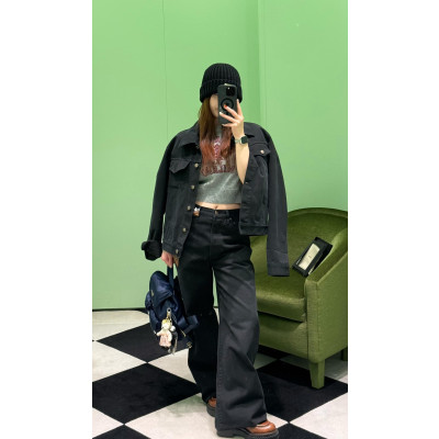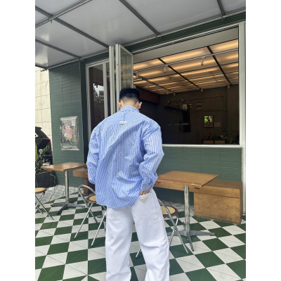 Prada徽标牛仔夹克 男士复古水洗单宁夹克 Prada三角标装饰夹克 定制臻绒高密幻影斜纹缎面料 保龄球翻领设计 合身版型 S-XL尺码 Prada男士休闲夹克
