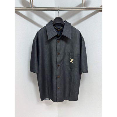 Louis Vuitton LV Letter Logo Cotton Denim Shirt|Stylish LV Raffia Embroidered Short Sleeve Shirt|Trendy Youth Cloth Shirt with LV Monogram|Fashionable Handwritten Louis Vuitton Logo Shirt|LV Cotton Denim Shirt with Embroidered Details