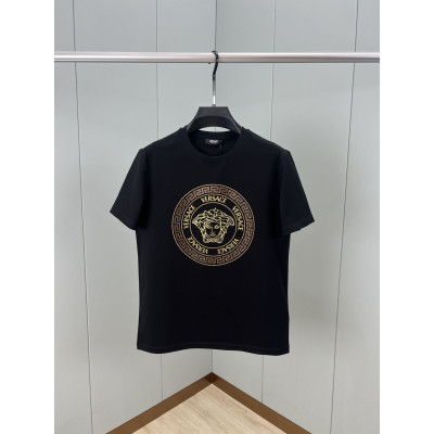 Versace 25 Spring/Summer New Heavy Crystal & Gold Medusa Logo Short Sleeve T-Shirt|Custom 80s Double Ply Mercerized Cotton Fabric|Available in Black, White, and Navy Blue|Sizes S to XXXL|Custom Sizes 4XL and 5XL Available in Black and White