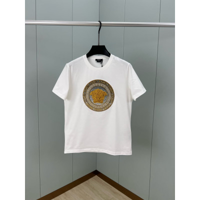Versace Embroidered Medusa Crystal Cotton T-Shirt|Luxury Custom Import Crystal Versace T-Shirt|Exclusive Medusa Embroidered T-Shirt|High-End Versace Cotton Tee with Crystal Details|Stylish Versace Short Sleeve T-Shirt with Unique Design