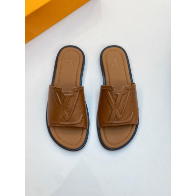 Louis Vuitton Portofino Sandals: Soft Grain Leather with V-Cut Design|Trendy LV Lettering on Leather Insole|Luxury Rubber Outsole with Louis Vuitton Logo|Wide Toe Box for Comfort|Perfect Summer Footwear Choice