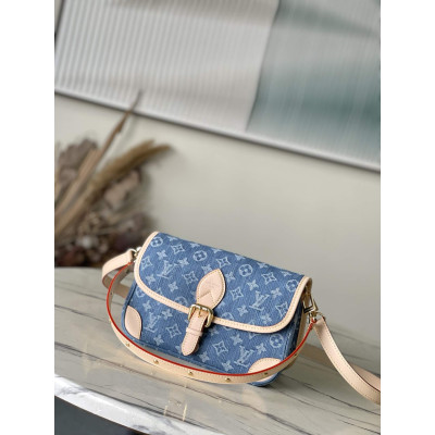 Louis Vuitton Diane Handbag in Monogram Denim with Leather Trim|Stylish and Functional Diane Bag with Detachable Strap|Luxury Monogram Denim Handbag by Louis Vuitton|Modern Diane Bag with Metal Accents|Versatile Louis Vuitton Handbag for Everyday Use